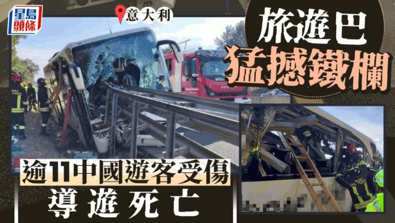 意大利有旅遊巴撞欄,一名中國導遊身亡。(圖片來源 X @Vigili del Fuoco)