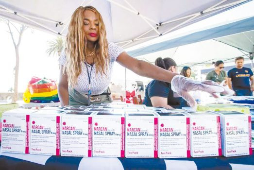 社區衛生工作者在麥克阿瑟公園分發納洛酮噴霧劑。洛杉磯時報