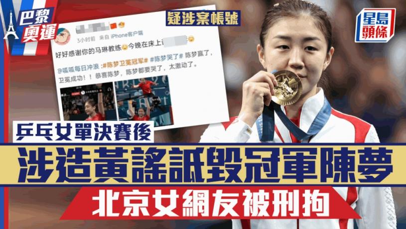 被刑拘網友疑似爲@healerhcy1 ,賬號顯示其爲孫穎莎的粉絲,造陳夢和教練馬琳的黃謠。
