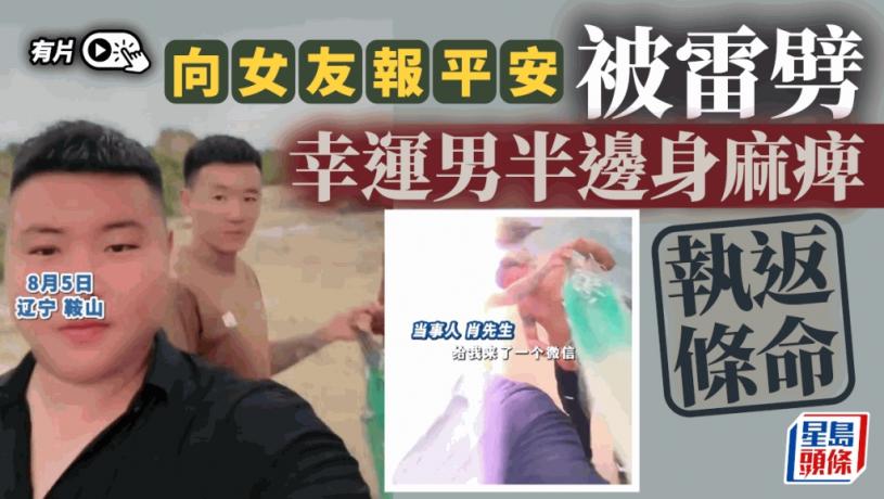 遼寧有網民日前在戶外拍片向女平報平安時,突被雷電劈中,嚇得他和友人不知所措,幸當事人到醫院檢查後無大礙,僅半邊身一度麻痺。網民紛指當事人好彩,因在雷雨天在戶外用手機拍片極危險,很容易引雷劈。
