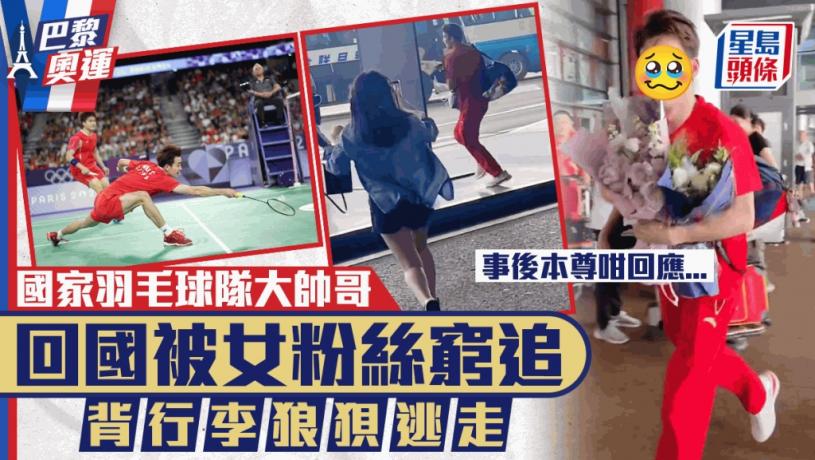 巴黎奧運羽毛球男雙金牌戰後,內地男子羽毛球手王昶因帥氣外型和自在打球態度吸粉無數。近日他搭機回國,一出機場就被大量女粉絲舉著手機圍堵狂追,手捧幾束鮮花的王昶一路狂奔突圍。
