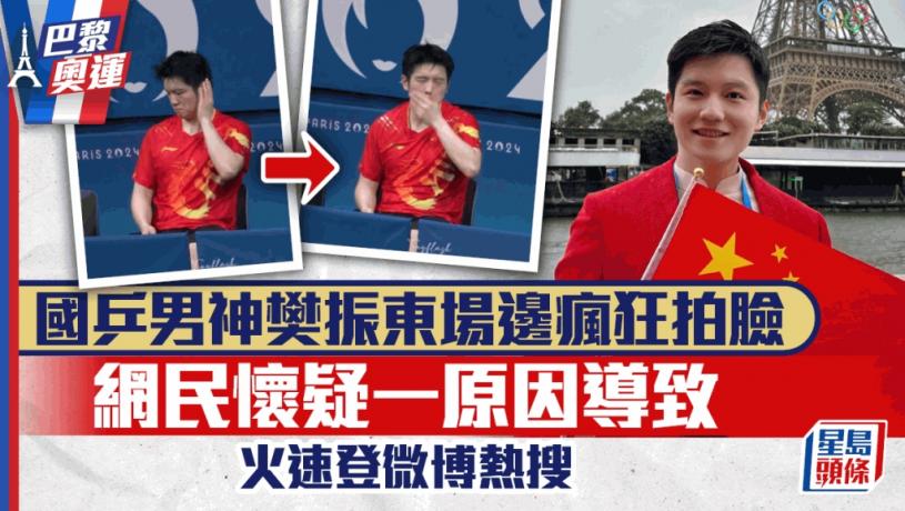 27歲國家隊乒乓球好手樊振東在巴黎奧運男單賽事上已取得金牌,今晚將以男子團體出戰爭金。樊振東在賽事舉行前,今日忽然登上內地微博熱搜,因一條網上瘋傳的影片,見到樊振東不斷拍打自己塊面,引起網民討論。