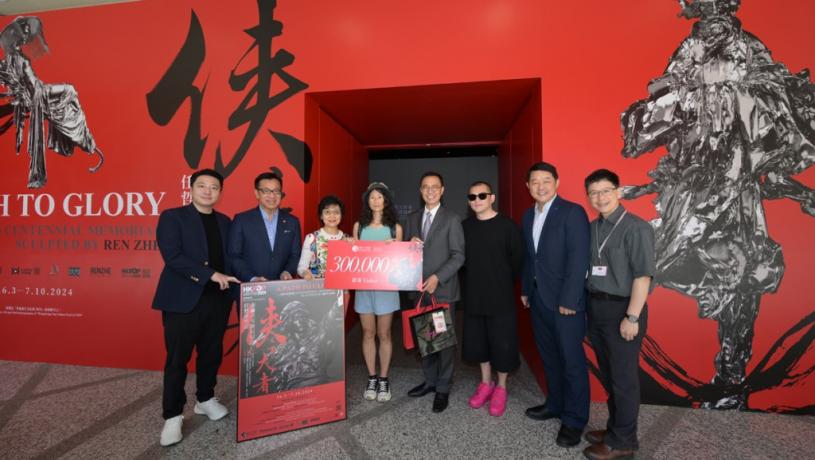 香港文化博物館為紀念金庸百年誕辰舉辦的「俠之大者──金庸百年誕辰紀念.任哲雕塑展」,開展近五個月,文化體育及旅遊局局長楊潤雄今天(9日)到博物館,與展覽聯合策展人、穀雨文化發展基金創辦人方圓明、雕塑家任哲,以及香港文化博物館總館長林國輝及粵語流行曲歌手張德蘭,迎接展覽的第30萬名參觀者。