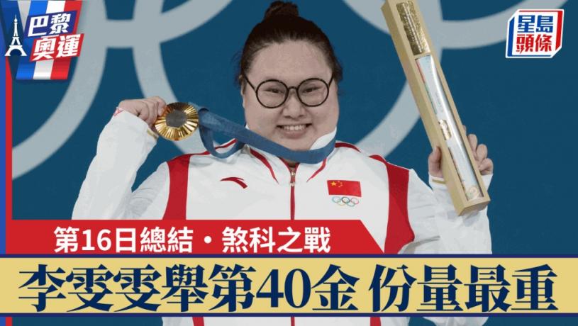 國家隊與美國就今屆巴黎奧運金牌「一哥」之位,鬥到周日第16日,最後一日的最後一個項目,國家隊由李雯雯於舉重女子81公斤以上級別奪得今屆第40金,刷新國家隊於境外奧運會單屆最多金牌紀錄。而美國於單車女子全能賽和最後一項的女子籃球連奪兩面金牌,金牌數目追至與國家隊同得40金,相相並列今屆奧運最多金牌國家。
