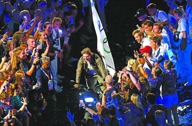 知名影星湯告魯斯從空中飛身而下接過五環旗,騎上電單車登上飛機前往洛杉磯。荷里活山上被巧妙地掛上了五環標誌。在紅辣椒樂隊、比莉.艾利什等人的歌聲中,表演環節進入尾聲。閉幕式開始時,帶走聖火燈的法國游泳運動員馬爾尚進入法蘭西體育場。國際奧委會主席巴赫宣布巴黎奧運閉幕,代表五大洲及難民隊的運動員,與馬爾尚一同吹熄燈內的聖火。經過19天的角逐,奧運會在巴黎落下帷幕。巴黎再見!洛杉磯,四年後再會!