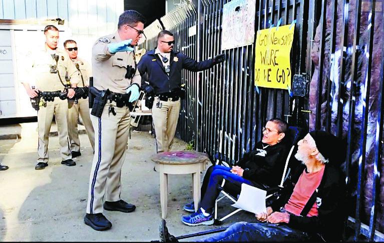 州長紐森下令大力掃除無家者營地,不少地方跟隨州府做法。加州運輸局日前清理位於屋崙的局方物業上的營地時,一名女民權律師用鐵鍊將自己鎖在圍欄上表達不滿,最後被捕。