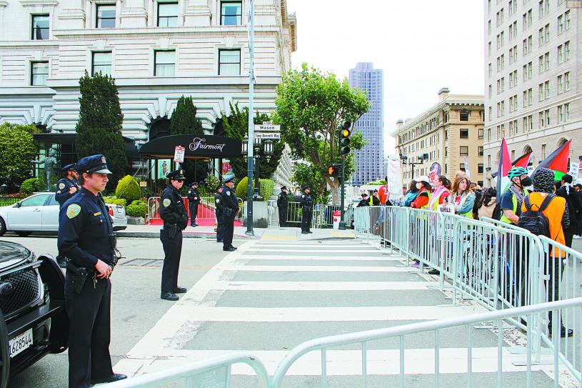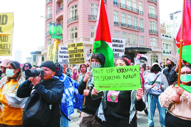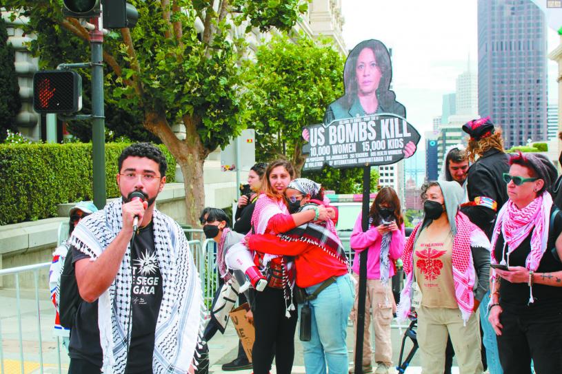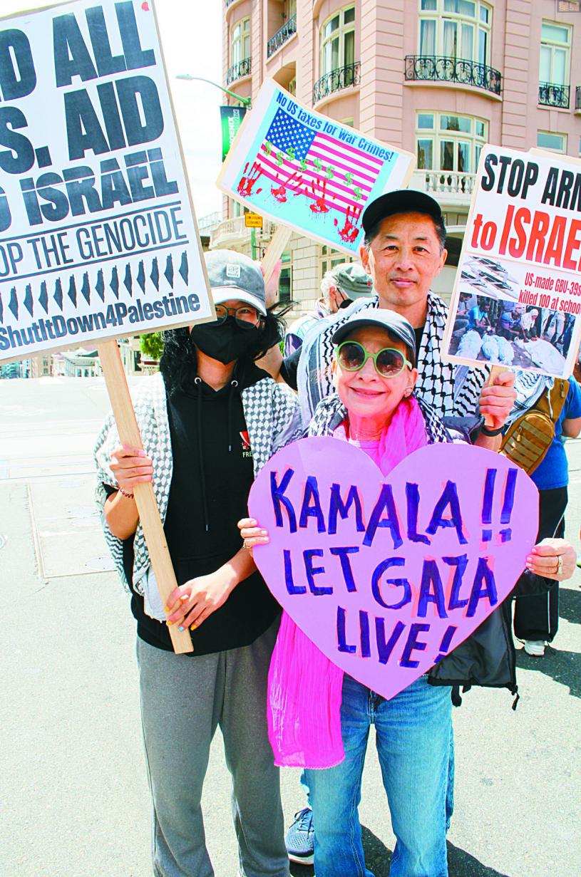 民主黨總統候選人、副總統賀錦麗周六(10日)晚抵達三藩市,周日(11日)在諾布山(Nob Hill)費爾蒙特酒店(Fairmont Hotel)舉行籌款活動。百餘名支持巴勒斯坦的民眾聚集在酒店外和平示威,要求賀錦麗行使副總統的權力終止軍援以色列,停止種族滅絕,否則將不會為她投票。