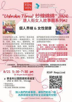 本期的活動將於8月21日(星期三)在麥金利公園圖書館會議室(1915 W 35th Street, Chicago, IL 60609)下午5時30分至7時30分舉行,當天的主題是:分享個人界線與女性健康,歡迎舊雨新知。