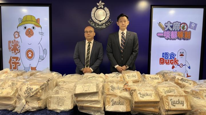 湛耀光(左)和唐為國展示檢獲的毒品證物。