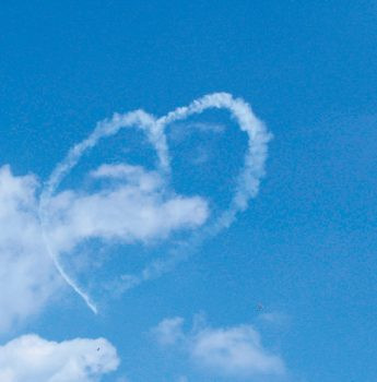 在芝加哥湖域上空,戰鬥機特技飛行如閃電似的飛越,留下滿滿的白霧愛意。 梁敏育攝