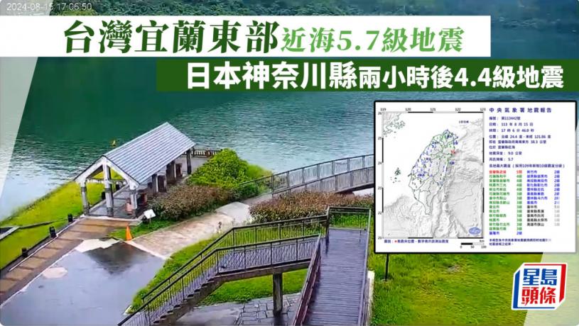 台灣宜蘭縣東部近海今日(15日)發生5.7級地震,台北有震感。陸續亦有餘震發生,宜蘭縣主震後再接連發生4.5級及4.3級的餘震,其他地區有輕度地震。