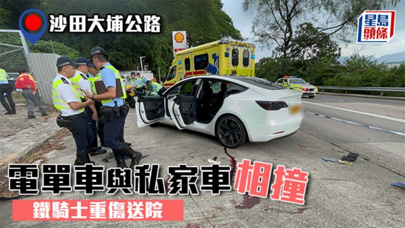今(5日)晨10時許,沙田大埔公路沙田嶺段發生交通意外,一輛電單車和一輛白色Tesla電動車相撞,鐵騎士人仰車翻倒卧地上,傷勢嚴重,救護員到場將他送院治理,初步證實雙腳骨折,警方調查後以涉嫌危險駕駛罪名拘捕姓辛(56歲)Tesla司機,他報稱不適,需要送院檢查。網上圖片示,Tesla右前門凹陷,玻璃碎裂。一輛藍色電單車橫亘路邊,殘件四散。