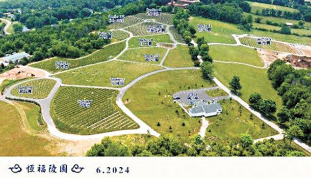 恆福陵園全景圖,展示不同方位朝向的中文園區。
