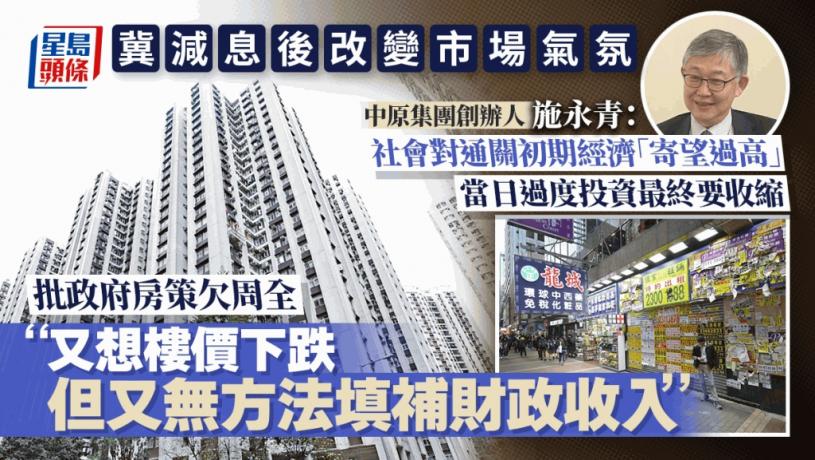 施永青又認為,政府的房屋政策不算思慮得很周全,一方面希望樓價下跌令多些人置業安居、做生意成本減低,可是地價一跌,政府財政收入就沒有保證,尤其如今地產商都不買地,「唔靠地產收入,你有冇銷售稅、人頭稅、累進稅?」他坦言以現時市況:「想樓價跌,都唔使去『隊冧』,你輕輕地『挨』一下佢都跌啦。」
