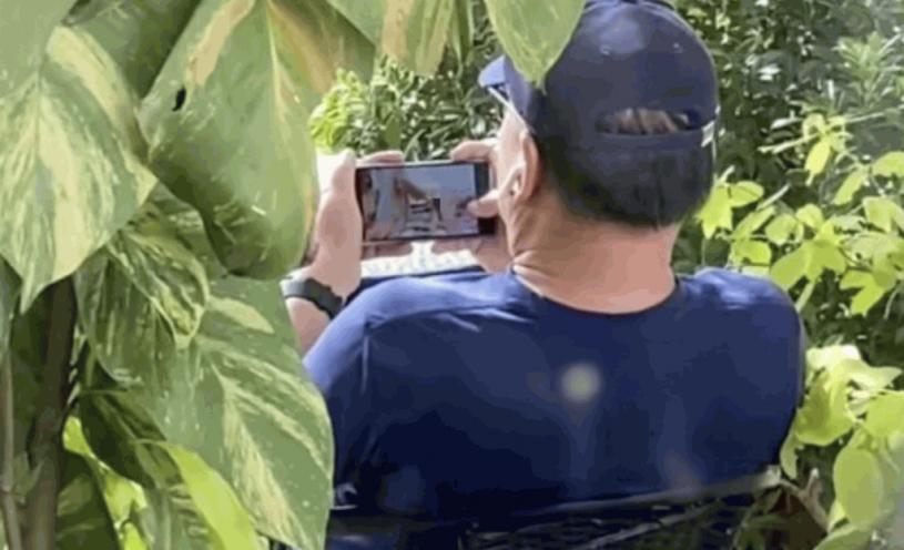 片中有一名年約50至60歲、戴着藍色CAP帽的大叔,正坐在咖啡店的露天茶座位置,忘情地拿着手機,定睛觀看影片。