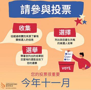 AJSOCAL強調,美國公民擁有投票的權利。新入籍和定居的亞太裔美國公民有資格投票,但必須滿足聯邦政府發佈的一份具體要求清單。投票站工作人員的任何額外要求都是違法的。投票材料及幫助資訊應有不同語言版本可提供。選民在登記投票時有權索取中文、越南語或西班牙文材料。如果選區內有足夠多的人使用同一種語言,則該選區內可能會提供其語語言的材料。洛杉磯及橙縣的官方名單已經列入資源中心。