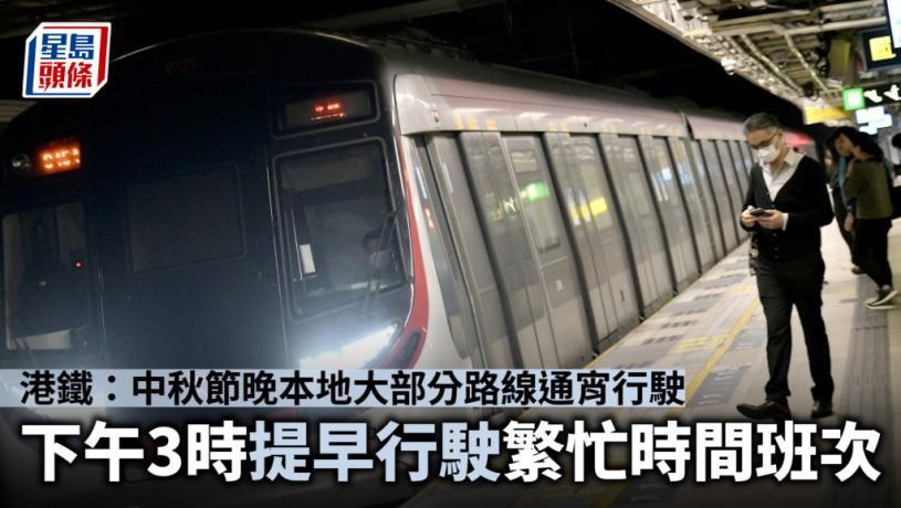 港鐵今日(10日)表示,指下周二(17日)中秋節晚上將加強鐵路服務,大部分本地路綫及部分輕鐵路綫將會通宵行駛。