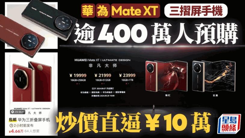 內地界面新聞報道,開啟預訂不到24小時內,Mate XT的預訂量已經超過200萬。最新的預購人數已逾425萬人。在「得物」等二手平台,Mate XT部分型號炒價已是9.9萬元(人民幣‧下同)。多名手機渠道人士早前已表示,價格即便掛到十萬元也不誇張,華為首款折疊屏Mate X就曾炒到過這個價格。