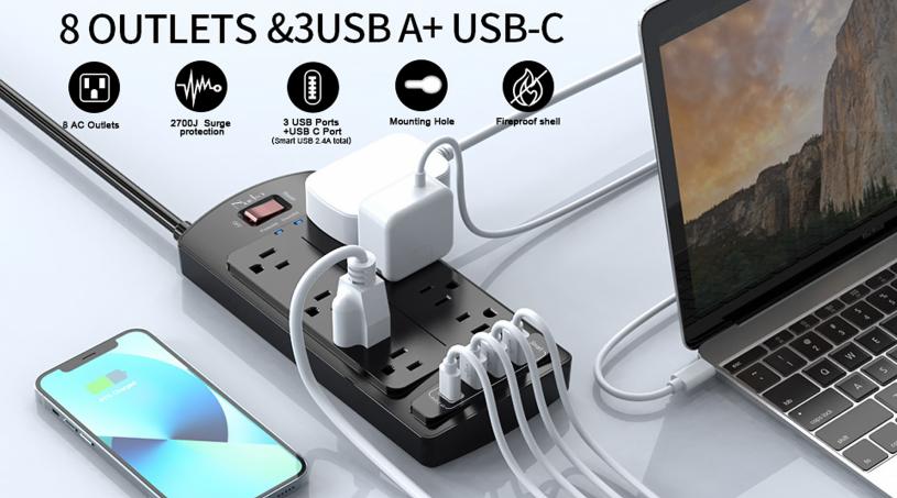 Nuetsa 電湧保護插線板,讓你充電更方便更安全!這款插線板有8個交流電源插座,3個USB A連接埠和1個USB C連接埠,4個USB端口總共提供3.4A電流,讓你的手機、平板和筆記本電腦都能快速充電。尤其是USB-C端口,支持最高3A的超快充電,幫你解決電量不足的煩惱。這款插線板還配有2個寬間距交流電源插座,完美容納大型轉接器,還有6個標準插座,讓你可以同時連接多個設備。45°插頭設計,讓你在使用插線板的時候,不會擋住其他插座,保持桌面整齊有序。它的三重保護系統,能吸收最小2700焦耳的能量,保障你的設備不受損害。1382°F阻燃材料外殼,讓它更加耐用和安全。