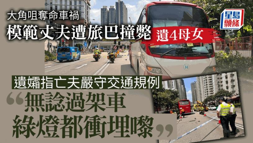 大角咀今日(12日)發生奪命車禍,一名51歲姓曹男途人遭一輛違法左轉的旅遊巴撞及,送院搶救後不治。消息指,死者為一名地盤雜工,是3個孩子的爸爸,一家五口的經濟支柱,詎料一次車禍遺下妻女4人,頓失依靠。遺孀曹太表示,丈夫平日遵受交通規例,從不「衝紅燈」,亦會教導女兒要綠燈才可以過馬路,未想到會遇到違規司機,「平日佢過馬路好小心,無諗過架車綠燈都會衝埋嚟」。