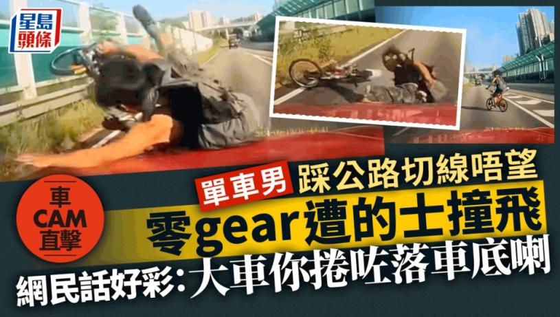單車友在快速公路踩車不時險象環生,引來其他道路使用者的批評及詬病。今(14日)網上流出一段車CAM片,一名沒戴頭盔、沒有任何保護裝置的男子在一條快速高路上踩單車,只見他在公路上「頭也不會」突然切線,被正駛前一部的士撞到彈上車頭冚再墮地,人車分離,幸的士及時剎車,未有將他輾過,他墮地後可立即起身,將單車推到路旁檢視一番。網民議論紛紛,直指在公路上踩單車猶如「馬路炸彈」,又質疑在公路上踩單車已違法,建議的士司機報警保障自己。