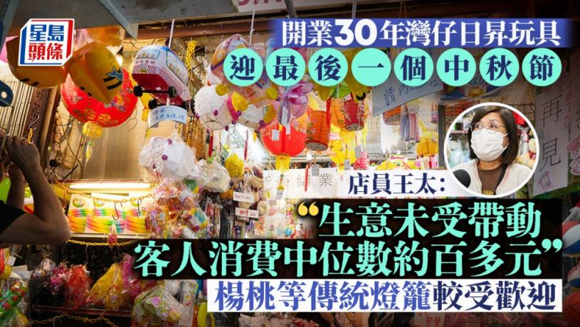 在太原街開業約30年的「日昇玩具」早前宣布在今年中秋後「光榮結業」,引發一波「打卡」告別潮。店員王太說,今年仍以兔子、楊桃、金魚等傳統形狀的燈籠較受歡迎,「尤其是較細隻的,方便攜帶」,惟生意卻未受即將結業效應帶動,客人消費中位數維持約百多元。客人年齡層方面則以長者佔多,不少買來送給孫兒,他們多選擇較安全的吹氣燈籠,但因近年興起懷舊熱,也不乏青年人專程前來購買傳統紙燈籠。