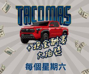 加入我們,參加每週六的Tacomas+現金酬賓大抽獎活動,從現在至10月26日,每小時抽獎一次,時間為晚上6點到10點。每週六晚上 10 點抽獎,贏取一輛豐田 Tacoma 卡車,以及每週 25 名幸運兒將贏得 $1,000 現金獎!不要錯過 10 月 26 日週六晚上 11 點的終極大獎抽獎。活動期間未被領取的所有汽車和現金獎品都將保證送出!