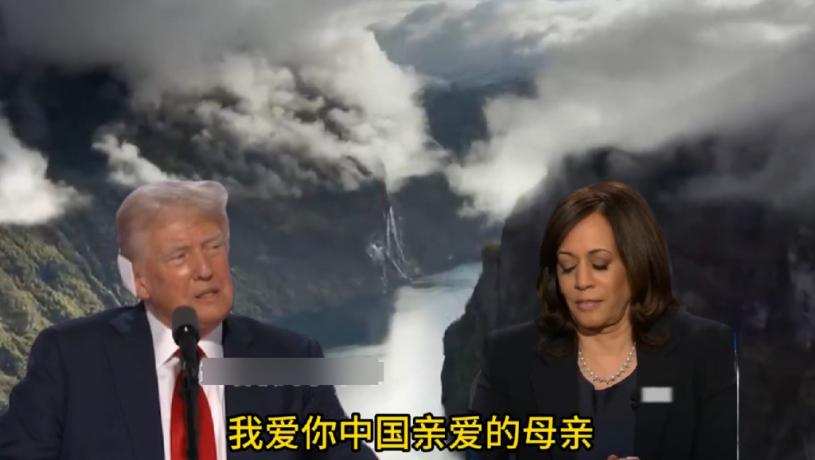 「我愛你,中國,親愛的母親,」身穿深色西服,打著他標誌性紅色領帶的美國共和黨總統候選人特朗普站在話筒前深情地唱道。他邊唱邊把目光滑向左側。