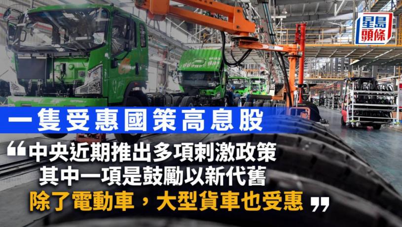 除了電動汽車,大型貨車也同樣享有舊換新的優惠,中國重汽(3808)是最值得考慮的重型車輛股,此股近日公布業績,利潤增長近40%,再加上舊換新政策肯定會使得下半年的業績增長再加速,成為高增長股,目前的P/E值不足8倍,股息率超過9厘,是屬於高息股。下半年如果能維持同樣的派息比例,股息率可能會超過10厘。在減息的大環境之下,吸引力很強。