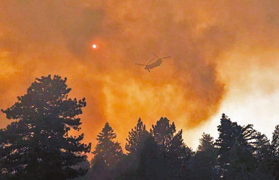一架消防直升機向奔泉地區山火灑水。洛杉磯時報