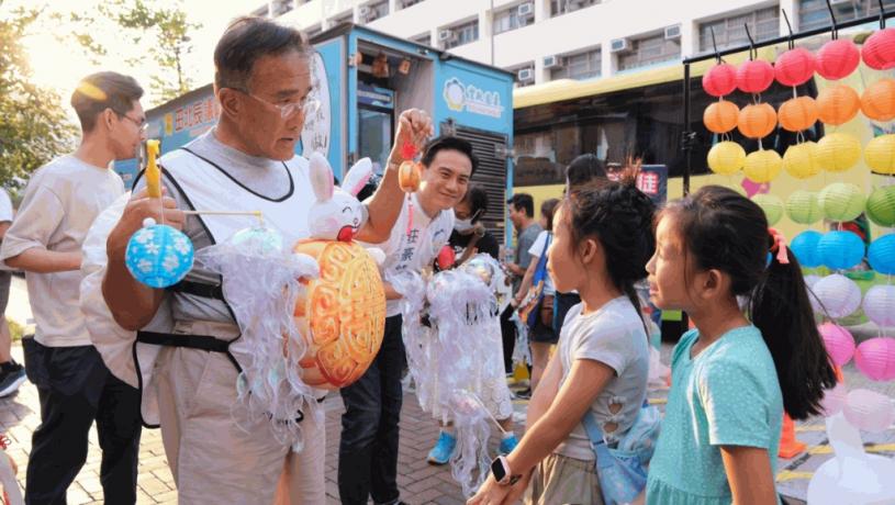 中秋佳節臨近,實政圓桌召集人、立法會議員田北辰的流動服務站(流動車)遊走屯門和元朗區,與市民共慶中秋。車上有夾公仔機,田北辰今日(15)亦抽空到場,與小朋友一起猜燈謎,只需要答對簡單問題,即可獲得獎品,答錯也有安慰獎。現場所見,意欲參加遊戲的市民排成一條長龍,全身掛滿燈籠、更化身月餅的田北辰也不時與排隊市民交流。