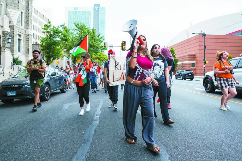 關以色列-哈馬斯戰爭的會議,並在校園外散發傳單,現在校園入口