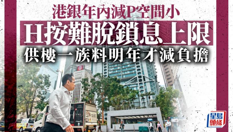 一眾業主關注美國減息後,何時能減輕供樓負擔,主要涉及銀行減最優惠利率(P息)、降低H按封頂息,以及1個月香港同業拆息(HIBOR)回落情況等。以滙豐目前P為5.875厘、H按封頂息是「P-1.75厘」計算,實際H按鎖息是4.125厘,而一般H按的利率是「H+1.3厘」,意味1個月HIBOR需回落至2.825厘以下,才脫離鎖息上限,令每月供樓款項有所減低。在減息預期下,最近1個月期HIBOR已回落至3.7厘,但仍遠高於2.825厘的關鍵水平。雖然市場預期今年聯儲局將下調聯邦基金利率0.5厘至1厘,惟本港銀行界人士認為,年內港息不會太快回落,減P空間有限,H按脫離鎖息上限的機率亦不大。