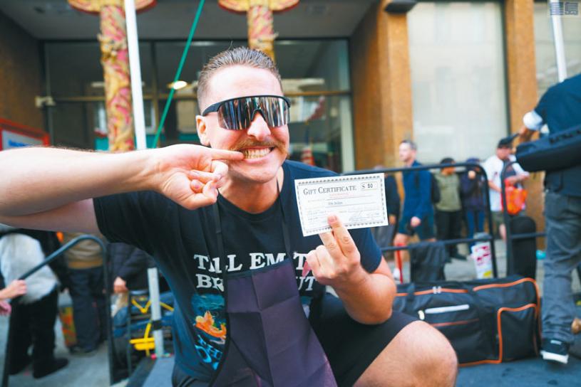 最搶眼的莫過於10多位頭戴熊貓頭套的年輕人,參加吃餃子大賽。每人簽下免責書,一聲令下,無論窈窕淑女,還是彪形大漢,瞬間變身餓鬼投胎,觀眾們不斷為選手喝彩加油,1分鐘的賽事,最少是8隻餃子,來自菲蒙市25歲的Joe,身材魁梧,比賽開始,他把筷子一扔,捧起滿碟餃子,直接倒進自己的大嘴,迎來現場觀眾們的驚呼。結果,Joe憑著1分鐘狂吞22隻餃子,贏得「餃子王」美譽。儘管獎品是一張價值50元的餐券,足夠這大塊頭炫耀了。