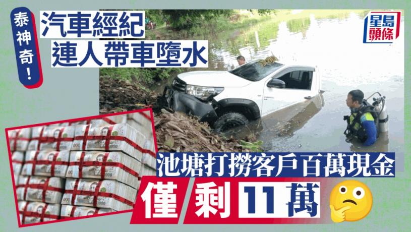 前日(14日),泰國一名汽車經紀駕駛一輛農夫車,車子卻意外駛進一處池塘裏。搜救人員將該司機救出,並送其往醫院治療。然而,車子內有420萬泰銖(約98.6萬元港幣)現金,經過打撈後,只找到50萬泰銖(約11.7萬元港幣)。