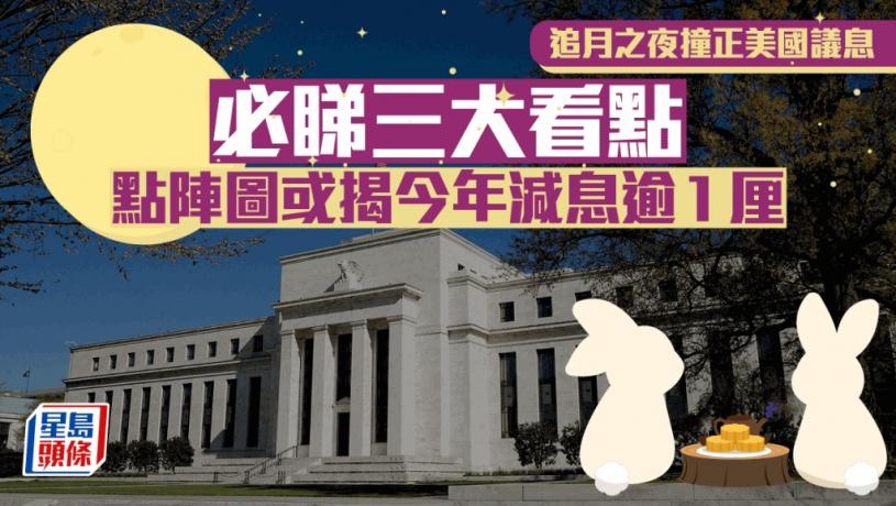 今晚是追月之夜,美國聯儲局同時亦會於香港時間周四(19日)凌晨2時公佈議息結果,備受市場關注。雖然市場預期聯儲局鐵定減息,但仍有三大看點,包括聯儲局究竟減息0.25厘還是0.5厘;「點陣圖」或揭示官員對利率前景傾向「鷹」或「鴿」;以及聯儲局主席鮑威爾會後出席記者會的措辭,隨時觸發股市大幅波動。