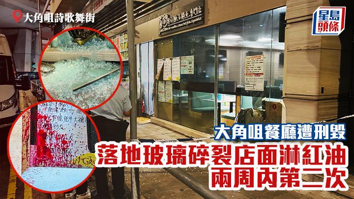 大角咀發生刑毀案。今日(19日)凌晨3時許,詩歌舞街83號一地舖車仔麵店的一幅向街2尺乘7尺落地玻璃,被人砸破,玻璃碎片散落一地,途人擔心店鋪遭人爆竊,於是代為報警。警員到場調查,發現店舖並無財物損失,但距離破碎落地破璃位置的店面亦遭淋紅油,估計歹徒擊破破璃後,伸手進店內潑紅油,舖頭地面及部分枱椅同遭殃。案件列刑事毀壞,由旺角警區刑事調查隊第7隊跟進。