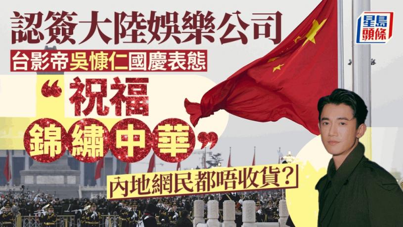 曾現身支持聲援太陽花學運的台灣金馬影帝吳慷仁,近日證實與中國大陸的「壹心娛樂」簽經紀約,引發網友熱議。今日是中華人民共和國國慶日,吳慷仁也第一時間轉發《人民日報》的「我愛你中國」賀國慶帖文,「祝福錦繡中華」。事件引發網友熱議。