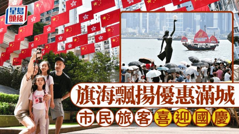 今天(10月1日)是中華人民共和國成立75周年,本港多處都掛起國旗及區旗,店舖食肆舉辦國慶優惠,市面上洋溢着歡慶氣氛。