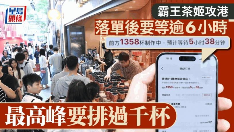 內地茶飲店攻港非新鮮事,獲投資推廣署加持的「霸王茶姫」3日前(9月28日)在尖沙咀開幕,適逢今日(10月1日)是國慶黃金周首日,不少內地遊客亦到場幫襯。《星島頭條》記者下午3時許到店舖,發現客人誇張地多,五湖四海的人都捧場,要排逾1,000杯,店員告知顧客下單後需等6小時才能取茶,不少客人聽聞後隨即「耍手擰頭」。
