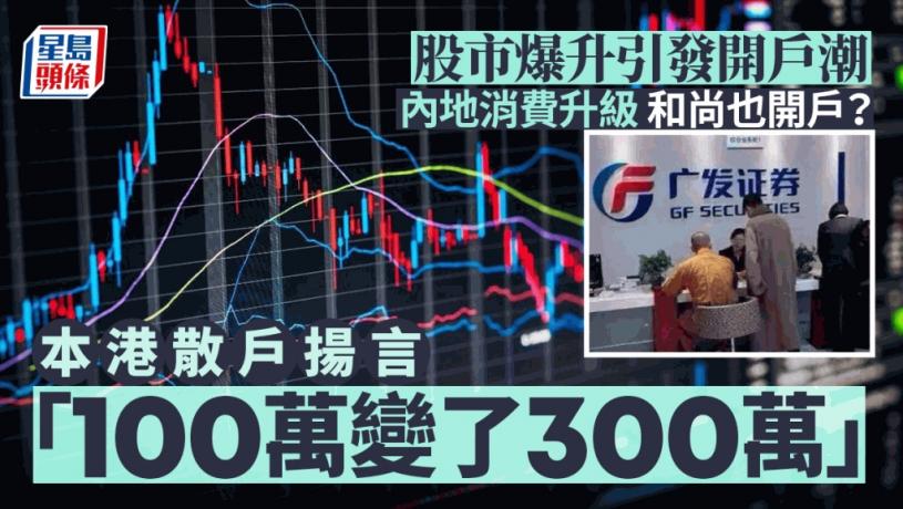 中港股市大升,吸引不少新力軍入場。據內媒報道,近一周新開賬戶投資者中,「00後」、「90後」佔比高達70%,部分券商要在國慶假期安排值班迎接開戶潮,甚至網傳排隊開戶人士包括和尚。本港方面,耀才、富途及老虎證券均出現開戶潮,部分新增開戶數量升逾一倍,更有散戶指出,近日升市獲利兩、三倍,「從100萬變了300萬,好滿足、好開心」。