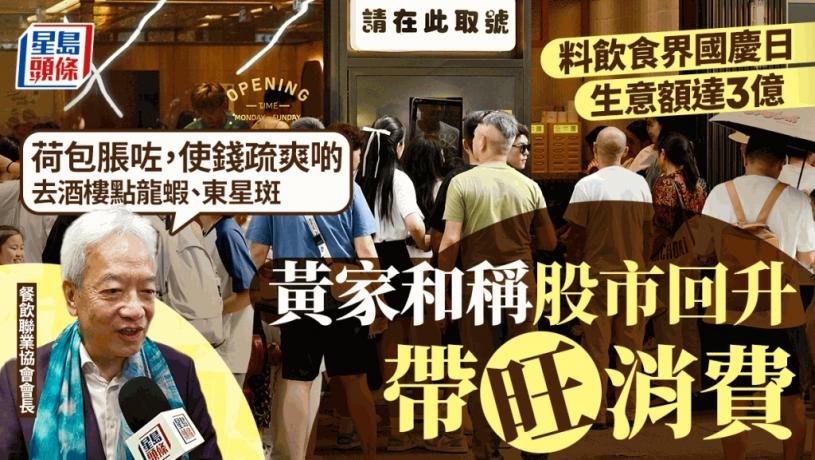香港餐飲聯業協會會長黃家和則稱,近日港股市場向好,相信不少人在股票巿場上獲利,當日有不少食肆和商戶推出國慶優惠,加上政府舉辦多項活動,多了人外出進餐,消費期間變得豪爽,例如到酒樓叫價錢較貴的龍蝦及東星斑。「佢哋覺得可能個荷包脹咗,使錢疏爽啲,所以就冇乜所謂。」而國慶日只有約20萬巿民北上,可見北上消費熱潮開始放緩,當日的餐飲業優惠亦助吸引巿民留港消費,預計生意達3億元,相信今年國慶黃金周的消費額已經超越去年。