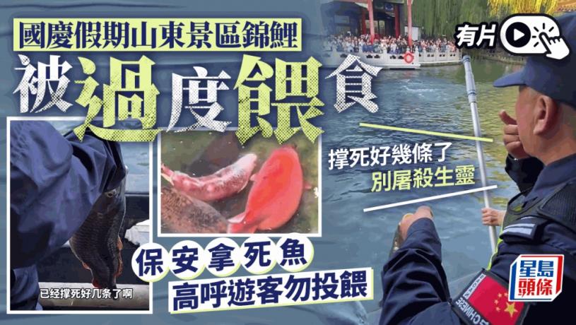 內地網友近日發布視頻稱,國慶黃金周期間,山東濟南趵突泉景區發生了多條魚兒因遊客過度投餵導致被撐死的事件。有保安手拿死魚勸阻遊客投餵:「大家千萬不要餵魚,已經撐死好幾條了,不要屠殺生靈!