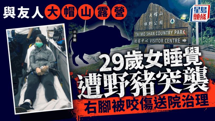 據悉,事發地點在大帽山山頂位置,當時女事主正在帳營中睡覺,野豬侵襲她的蓬帳,然後在她的右邊小腿咬了一下,女事主馬上從睡夢中驚醒,並喚醒朋友將野豬驅離。
