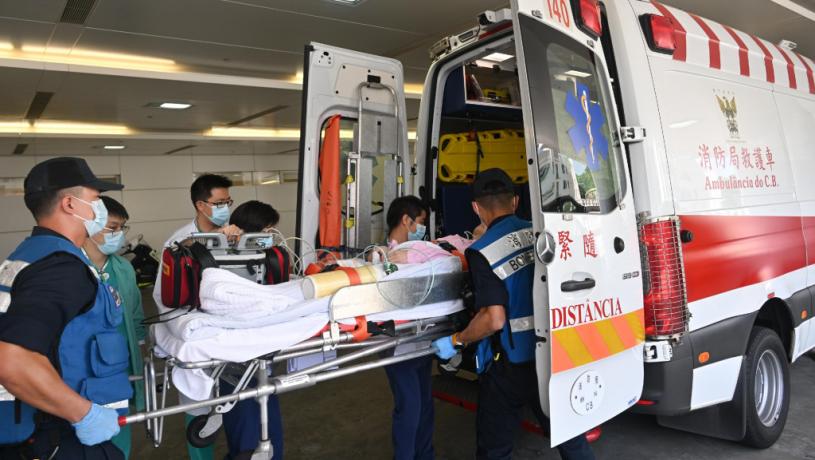 澳門仁伯爵綜合醫院的醫護人員模擬運送病人離開病房,前往香港瑪嘉烈醫院。政府新聞處