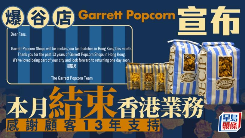 人氣爆谷店Garrett Popcorn今晚(8日)在社交平台宣布,本月會結束香港業務,感謝顧客過去13年的支持,期待重回香港。