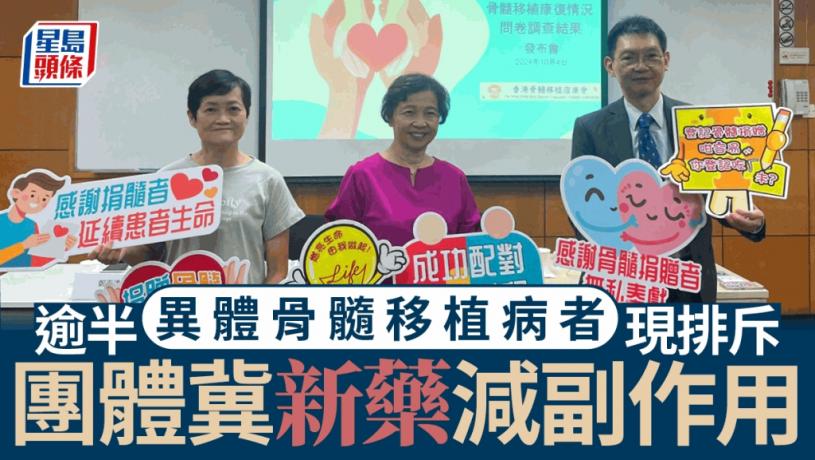 血癌及血液病症患者獲得脗合的骨髓移植可獲重生機會,但患者接受異基因骨髓移植後有機會出現急性或慢性移植物抗宿主病(aGVHD及cGVHD),俗稱「排斥反應」,嚴重影響生活。為了解患者康復程度,香港骨髓移植復康會8月向患者進行問卷調查,約5成異基因骨髓移植受訪者出現移植物抗宿主病,其中約8成冀新藥有更少副作用並更快納入安全網。有曾接受骨髓移植的患者希望政府可以引入更多改善排斥的藥物,作針對性治療。