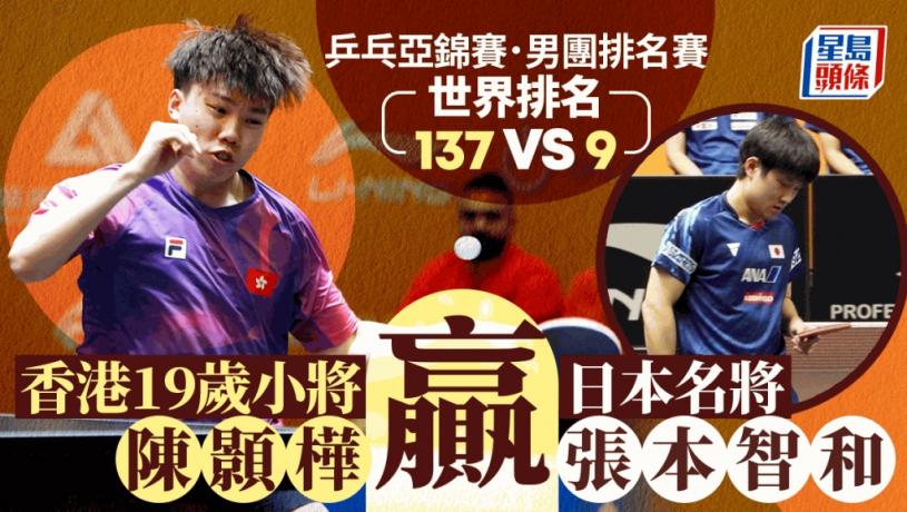 周四乒乓球亞洲錦標賽男團排名賽,港隊大戰日本。為港隊打頭陣、世界排名137位的陳顥樺,神勇地以局數3:1擊敗日本名將張本智和,助港隊先拔頭籌。其後日本隊連贏兩仗,大比分反超前2:1,第四場張本智和再度上陣,盤數1:3不敵另一位港隊小將姚鈞濤,總比分港隊扳平2:2,惟於第5場上陣的陳顥樺,以局數2:3不敵戶上隼輔,港隊總比分以2:3不敵日本。