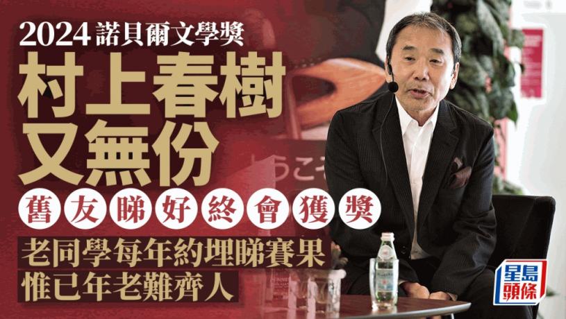 2024年諾貝爾文學獎由韓國女作家韓江獲得。自2006年來,一直被視為大熱得主的日本作家村上春樹,今年仍然好夢落空。日本《體育報知》報道,村上春樹位於兵庫縣西宮市的母校香櫨園小學,有10名他當年的同學與學校相關人士一起觀看文學獎揭曉直播。可惜結果出爐後,現場陷入一片沉默。