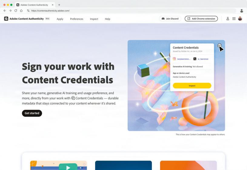 Adobe正在擴展其「內容憑證」(Content Credentials)服務,使創作者更容易因其作品而獲得認可,識別互聯網上內容是否出自人工智能(AI),並在此過程中保護自己創作的內容。Adobe的免費網頁延伸程式(extension),讓用戶快速將創作者資訊植入圖片、視頻和音頻,甚至可以選擇退出用於生成式AI模型的訓練。